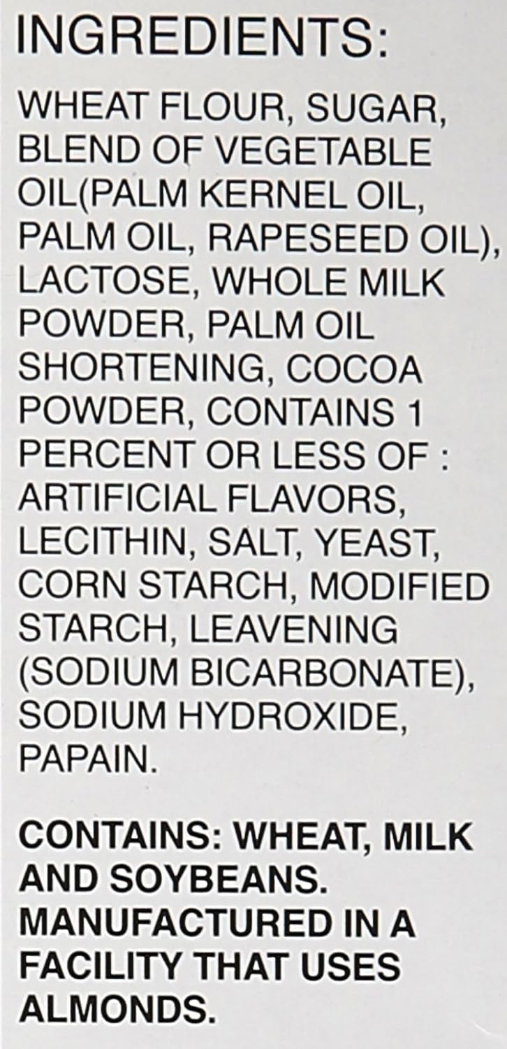 Wheat Flour, Sugar, Fully Hydrogenated Palm Oil, Whole Milk Powder, Lactose, Modified Food Starch, Inulin, Shortening (Palm Oil, Fully Hydrogenated Palm Oil), Cocoa Powder, Whole Wheat Flour, Contains 1 Percent or Less of: Artificial Flavor, Soy Lecithin, Salt, Baker's Yeast, Corn Starch, Sodium Bicarbonate.
