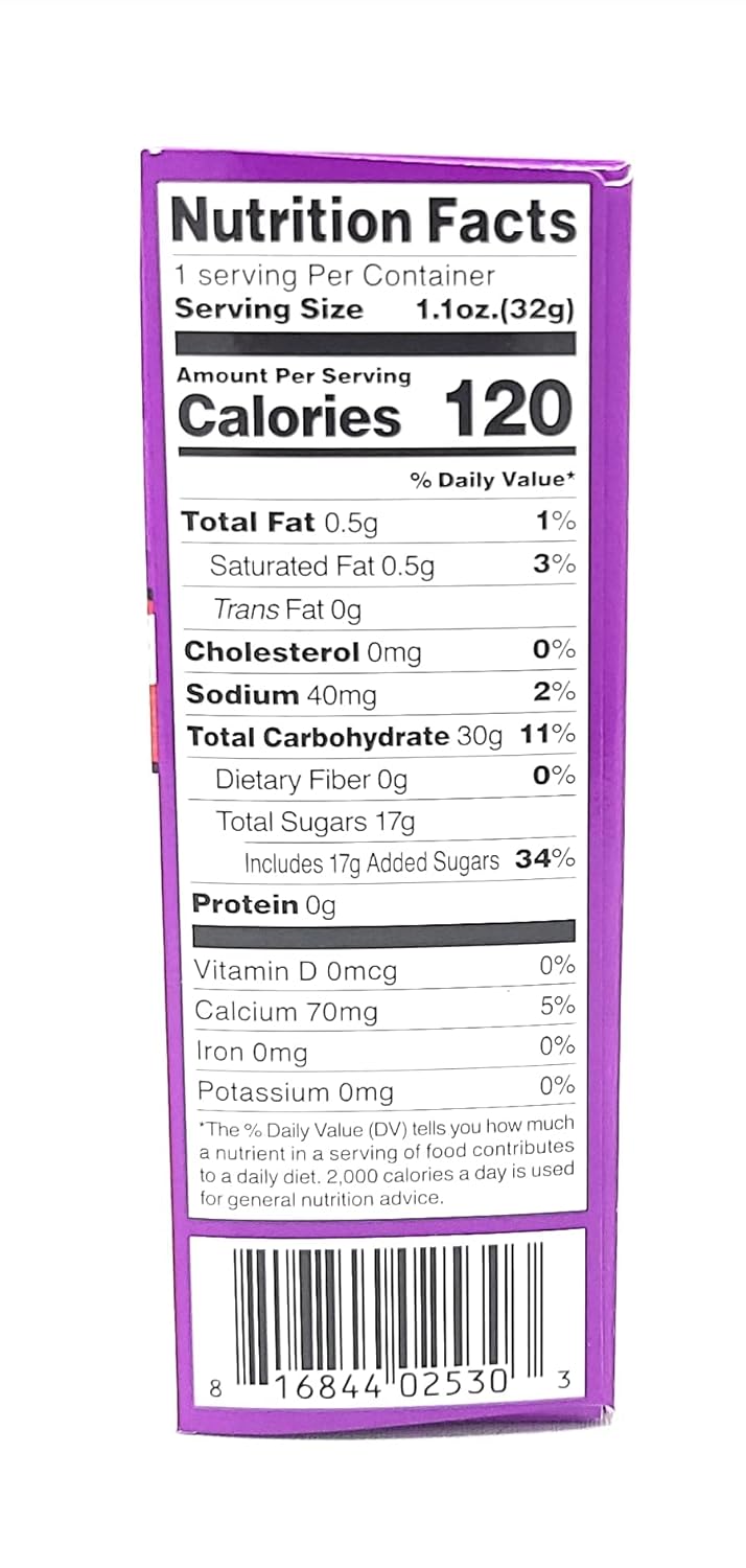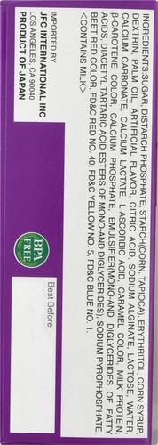 Sugar, Distarch Phosphate, Starch (Corn, Tapioca), Erythritol, Corn Syrup, Dextrin, Palm Oil, Artificial Flavor, Citric Acid, Sodium Alginate, Lactose, Water, Calcium Carbonate, Calcium Lactate, L-Ascorbic Acid, Caramel Color, Milk Protein, B-Carotene Color, Calcium Phosphate, Emulsifier (Mono and Diglycerides of Fatty Acids, Diacetyl Tartaric Esters of Mono and Diglycerides), Sodium Pyrophosphate, Beet Red Color, FD&C 40, FD&C Yellow 5, FD&C Blue 1.